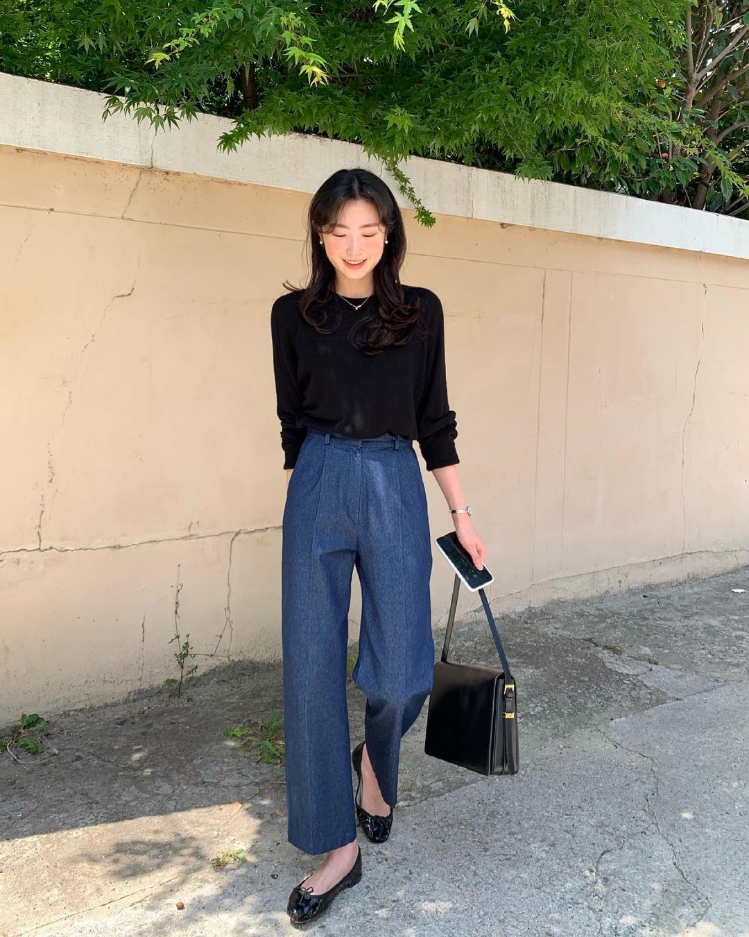 2. Quần tây đen dài trên mắt cá chân và loe nhẹ ở gấu quần rất đáng mua